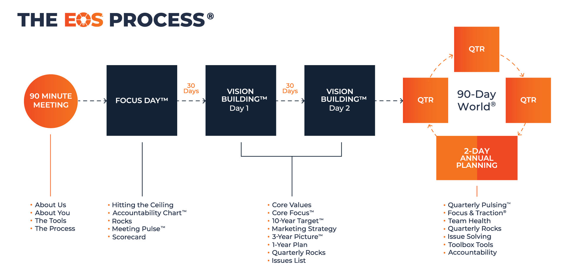 If you want to achieve your goals quicker, there is no finer way than working with someone that has been there, seen it and done it. Using the EOS system purely, this is what an Implementer does. Teaches, facilitates and coaches the senior leadership teams to success following the Proven Process below.